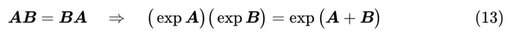 也就是说,如果 的乘法可以交换,那么矩阵指数就可以像数的指数一样将乘法转换为加法。不过要注意这是一个充分不必要条件。