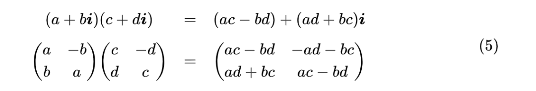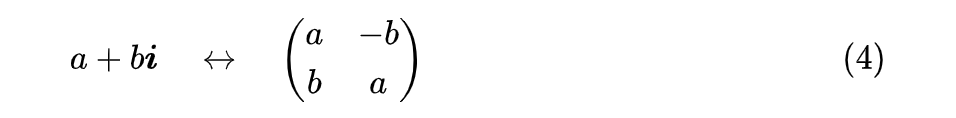 在高中时我们就学习过,复数 跟二维向量 是一一对应的(为了跟后面的四元数对齐,这里把虚数单位 也加粗了),但这个对应关系只能保持加减法对应(因为向量没有通用的乘法运算)。更精妙的对应是将复数与矩阵对应:
