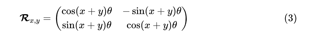 其中这个解很容易理解,它是两个一维 RoPE 组成的分块矩阵,实现上它就是将输入向量分为两半,一半施加 x 的一维 RoPE,一半施加 y 的一维 RoPE。由此形式我们也不难类比三维、四维等位置的 RoPE。
