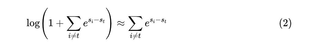 相比于交叉熵,上述损失就是在 运算中去掉了正样本对的得分 。注意到 通常可以有效地计算,浮点误差不会占主导,因此我们用上述损失函数取代交叉熵,理论上跟交叉熵是等效的,而实践上在小 batch_size 时效果比交叉熵要好。此外,需要指出的是,上式结果不一定是非负的,因此换用上述损失函数后在训练过程中出现负的损失值也不需要意外,这是正常现象。