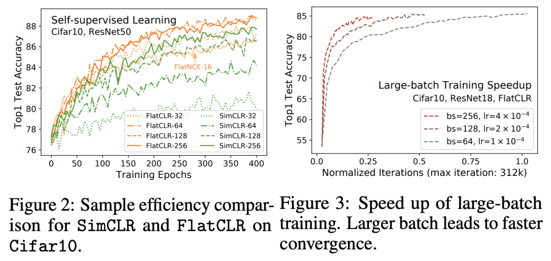 ▲ 不同 batch_size 下 SimCLR 与 FlatCLR 对比图