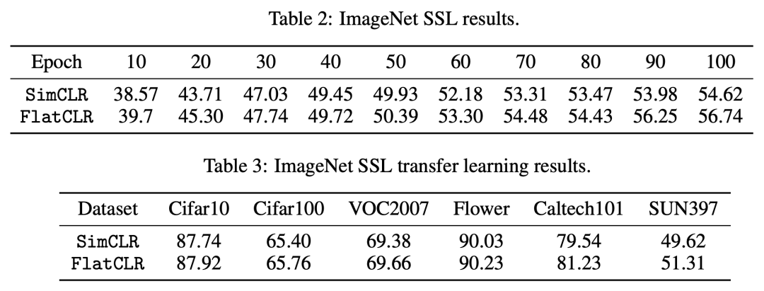 下面则是 SimCLR 和 FlatCLR 在各个任务上的结果对比,显示出 FlatCLR 更好的性能: