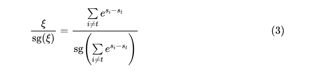 为损失函数。这里 是 stop_gradient 的意思(原论文称为 detach),也就是把分母纯粹当成一个常数,求梯度的时候只需要对分子求。这就是原论文提出的替代方案,称为 FlatNCE。