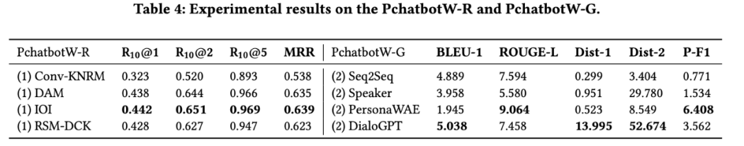 在此基础上,作者给出了基于检索和基于生成的对话模型的基准效果,为后续实验提供支持。