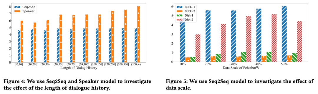 作者进一步分析了对话长度和训练数据多少的影响,发现对话的长度增加的确有利于模型效果的提升,而过多的训练数据可能会导致模型倾向于生成更类似的回复。