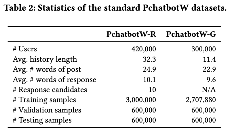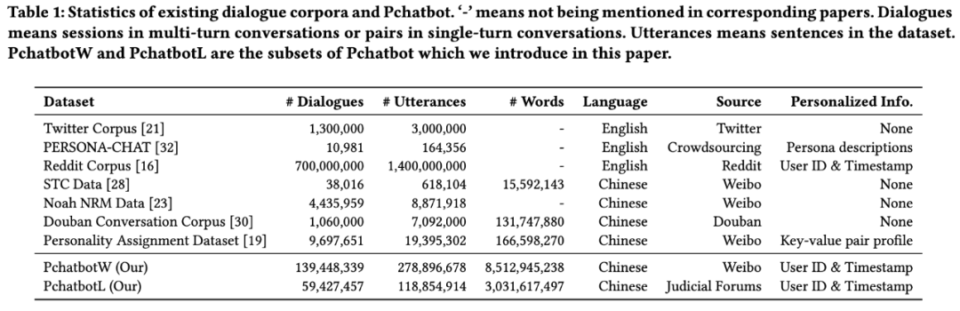为了使原始数据集适应对话系统,作者通过匿名化、重复数据删除、分割和过滤等过程精心标准化原始数据集。Pchatbot 的规模明显大于现有的中文数据集,这可能有利于数据驱动模型。