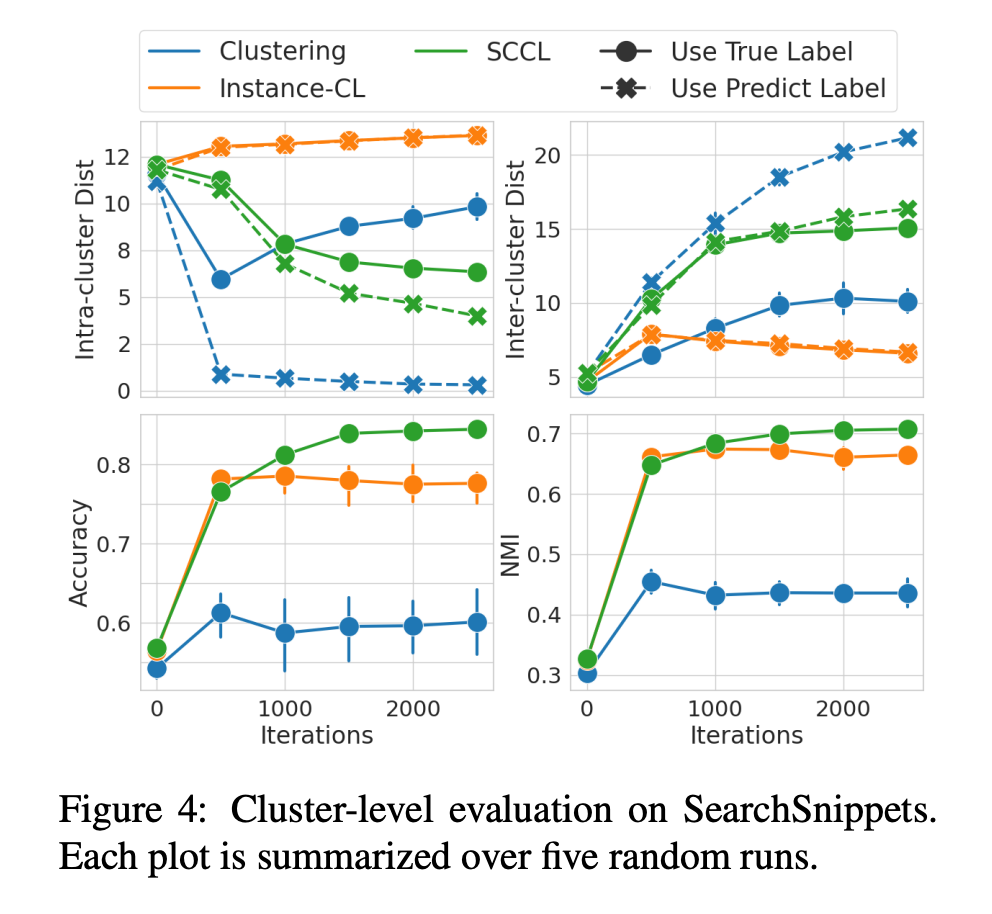 为了进一步研究是什么使得 SCCL 具有更好的性能,本文在整个学习过程中跟踪了在表示空间中评估的簇内距离和簇间距离。对于一个给定的簇,簇内距离是质心和所有归入该簇的样本之间的平均距离,簇间距离是到其最近的邻居簇的距离。计算每一种类型的距离及其平均值,其平均值是通过对所有聚类求平均值而获得的,其中聚类是根据真实标签(实线)或模型预测的标签(虚线)来定义的。