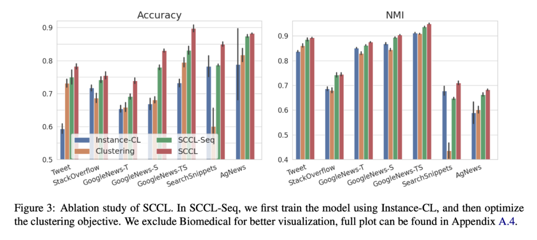 除了 Instance-CL 和 Clustering 之外,本文还根据 SCCL 的顺序版本(SCCL-seq)评估 SCCL,在该版本中,首先使用 Instance-CL 训练模型,然后使用 Clustering 对它进行优化。