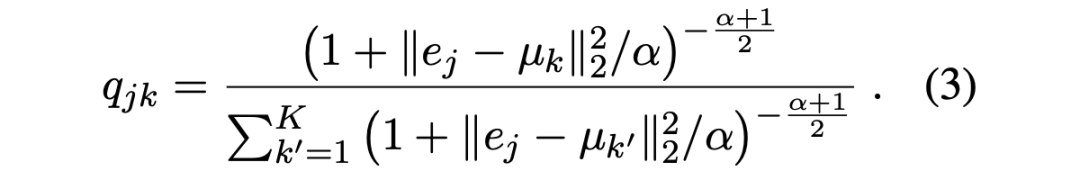 表示 B 中 xi 的表示。继 Maaten 和 Hinton(2008)之后,本文使用 Student 's t- 分布来计算分配 xj 到第 k 个簇的概率。