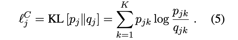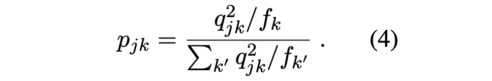 这里 fk,可以解释一个小批量样本的软聚类频率。该目标分布首先使用软分配概率 qjk 的平方进行锐化,然后用相关的聚类频率对其进行归一化。通过这样做,可以鼓励从高置信簇分配中学习,同时对抗不平衡簇造成的偏见。
