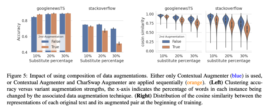 Figure 5 显示了使用合成数据增强的影响,其中探讨了 contexttual Augmenter 和 CharSwap Augmenter。在 GoogleNews-TS 上使用数据增强组合确实提高了 SCCL 的性能,每个文本实例的平均单词数为 28(见表2)。然而,在 StackOverflow 上观察到相反的情况,每个实例的平均单词数为 8。这一结果不同于在图像领域观察到的,其中使用数据增强的合成是关键的对比学习,以获得良好的性能。