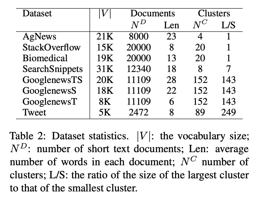 STCC(Xu et al., 2017)由三个独立的阶段组成。对于每个数据集,它首先使用Word2Vec方法在大型领域内语料库上预先训练单词嵌入(Mikolov et al., 2013a)。然后对卷积神经网络进行优化,以进一步丰富输入 K-means 进行最后阶段聚类的表示。