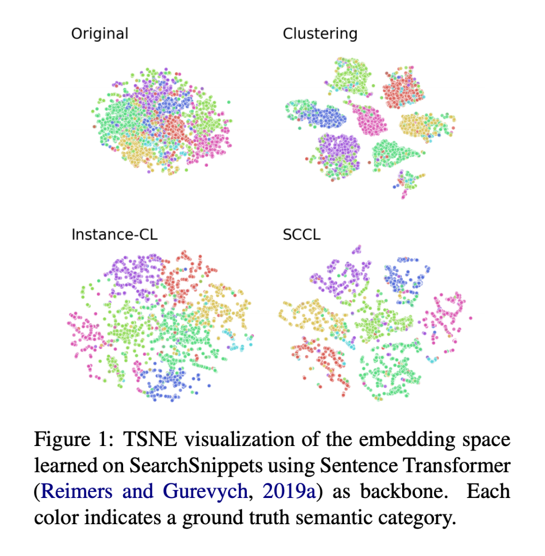 本文提供了深入的分析,并演示了 SCCL 如何有效地结合自上而下的聚类和自下而上的实例对比学习,以实现更好的类间距离和类内距离。