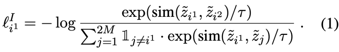 设 i1∈{1,…,2M} 表示扩增集 Ba 中任意实例的索引,i2∈{1,. . ., 2M} 为 Ba 中另一个实例的索引,和原集合 B 中同一实例索引一致。将 xi1,xi2∈Ba 作为一个正样本对,而将 Ba 中的其他 2M-2 例子作为这个正对的负样本。通过最小化 l1 来将正样本对和其他负样本对分离开