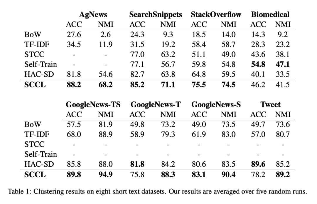 SCCL 模型在大多数数据集上优于所有基线。尽管在生物医学方面落后于 Hadifar 等人(2019年),但考虑到生物医学与 transformer 预训练的一般领域关系不大这一事实,SCCL 仍显示出很大的前景。因为,Hadifar 等人(2019)是在大型领域内生物医学语料库上学习单词 embeddings,然后使用逐层预训练的自动编码器来进一步丰富表示。