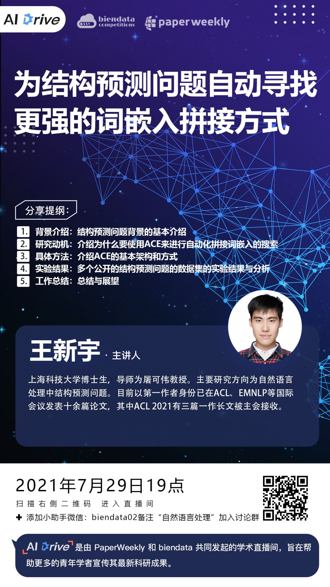 本期 AI Drive,我们邀请到上海科技大学博士生王新宇,为大家在线解读其发表在 ACL 2021 的最新研究成果:Automated Concatenation of Embeddings for Structured Prediction。对本期主题感兴趣的小伙伴,7 月 29 日(周四)晚 7 点,我们准时相约 PaperWeekly B 站直播间。