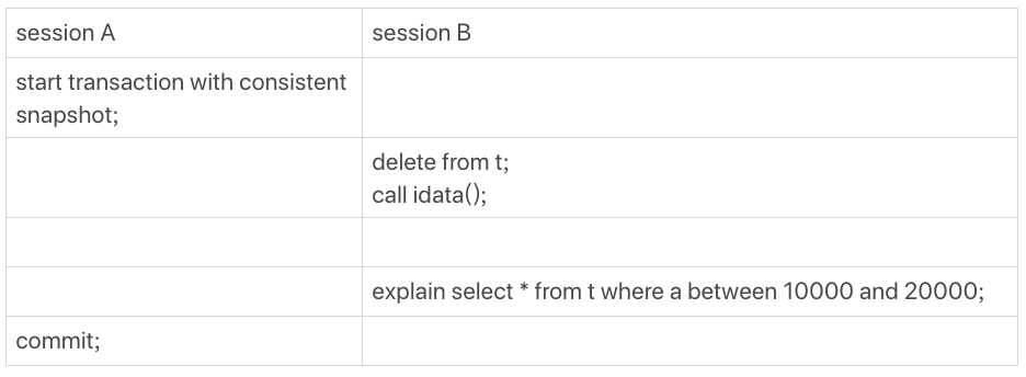 这里,session A 的操作你已经很熟悉了,它就是开启了一个事务。随后,session B 把数据都删除后,又调用了 idata 这个存储过程,插入了 10 万行数据。为了说明优化器选择的结果是否正确,我增加了一个对照,即:使用 force index(a) 来让优化器强制使用索引a.