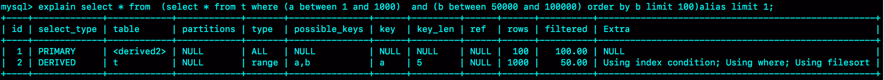 select * from (select * from t where (a between 1 and 1000) and (b between 50000 and 100000) order by b limit 100)alias limit 1;