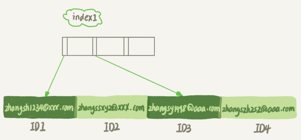 相比,这个语句只要求返回 id 和 email 字段。所以,如果使用 index1(即 email 整个字符串的索引结构)的话,可以利用覆盖索引,从 index1 查到结果后直接就返回了,不需要回到 ID 索引再去查一次。而如果使用 index2(即 email(6) 索引结构)的话,就不得不回到 ID 索引再去判断 email 字段的值。