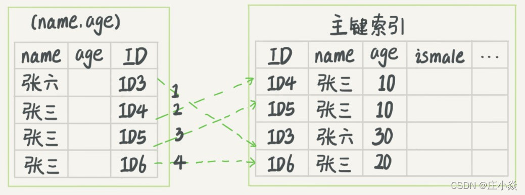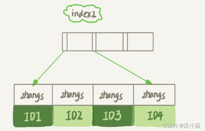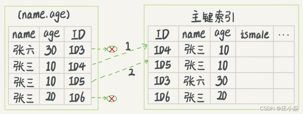 - 从 index2 索引树找到满足索引值是’zhangs’的记录,找到的第一个是 ID1;