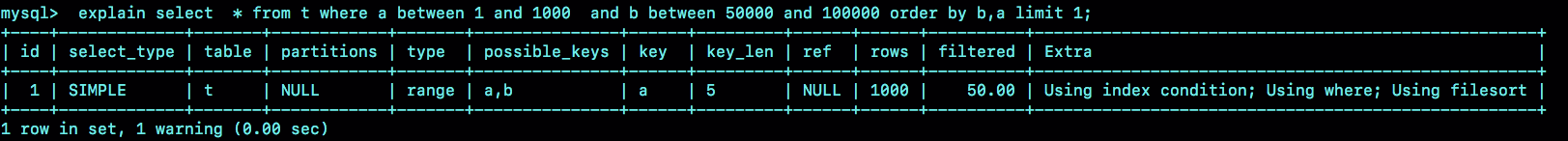 explain select * from t where (a between 1 and 1000) and (b between 50000 and 100000) order by b limit 1;