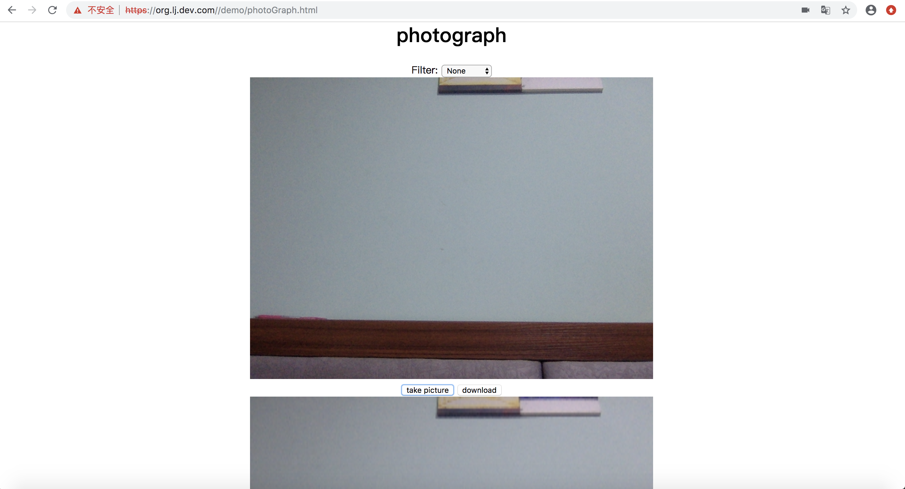 var myPlayer = {mediaStreamContrains: {//video:true,video: {width: 640,//视频宽度height: 480,//视频高度frameRate:15,facingMode: "environment" //user前置摄像头 environment后置摄像头 left 前置左侧摄像头 right前置右侧摄像头},audio: false,aspectRatio: 1.333333333333333333,//视频宽度/高度resizeMode: "none",//是否允许调整图像大小echoCancellation: true,//自动开启回音消除autoGainControl: true,//是否开启自动增益noiseSuppression: true//是否开启降噪},init: function () {var _this = this;_this.initMediaStream();_this.eventBind();},initMediaStream: function () {if(!navigator.mediaDevices ||!navigator.mediaDevices.getUserMedia){console.log("mediaStream is not supported by browser!");return;}navigator.mediaDevices.getUserMedia(this.mediaStreamContrains).then(this.setSrc).catch(this.handleError);},setSrc: function (mediaStream) {window.stream = mediaStream;localVideo.srcObject = mediaStream;},handleError: function (e) {console.log("handleError error," + e);},eventBind: function () {var _this = this;var picture = document.getElementById("picture");var filter = document.getElementById("filter");document.getElementById("save").onclick = function () {picture.className = filter.value;picture.getContext("2d").drawImage(localVideo, 0, 0, picture.width, picture.height);};document.getElementById("download").onclick = function(){_this.downLoad(picture.toDataURL("image/jpeg"));}filter.onchange = function () {localVideo.className = this.value;}},downLoad: function (url) {var aLink = document.createElement("a");aLink.download = 'photo_' + new Date().getTime()+".jpg";aLink.href = url;document.body.appendChild(aLink);aLink.click();aLink.remove();}