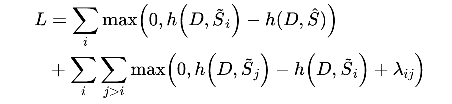 打分模型 的训练损失可以采用对比学习的思想,在前人的对比学习工作中,通常会显式地建立正样本和负样本,而这里我们可以将对比损失推广到排序损失(ranking loss):