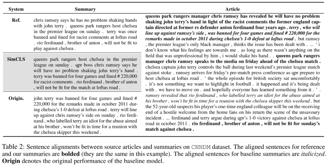 下图展示了一例摘要和原文的句子级匹配结果,可以看到 SimCLS 对齐的句子和参考摘要更为相近,而 baseline 关注了不够相关的句子。有趣的是,这里的参考摘要匹配到了原文的最后一句,而 SimCLS 很好地捕捉到了这一模式。