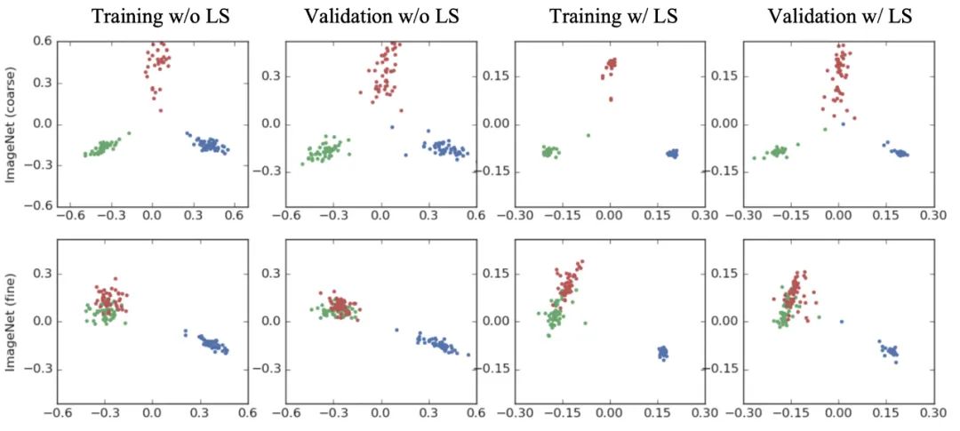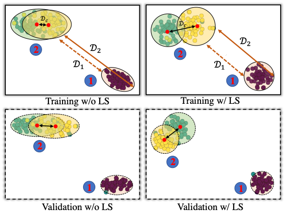 如果我们重新来审视上图中两个语义相似的类别(左侧的两个靠近的类别),当使用标签平滑时,同一类别样本聚集会更加紧密,因为标签平滑会促使每个样本与该类中其他样本的类中心等距,而紧密的聚类会显著促进语义相似的不同类的表示变得更加可分离,即两个类中心距离 Dc 增大了,这进一步变现为语义相近但是不同类的样本获得更可区分的表达。