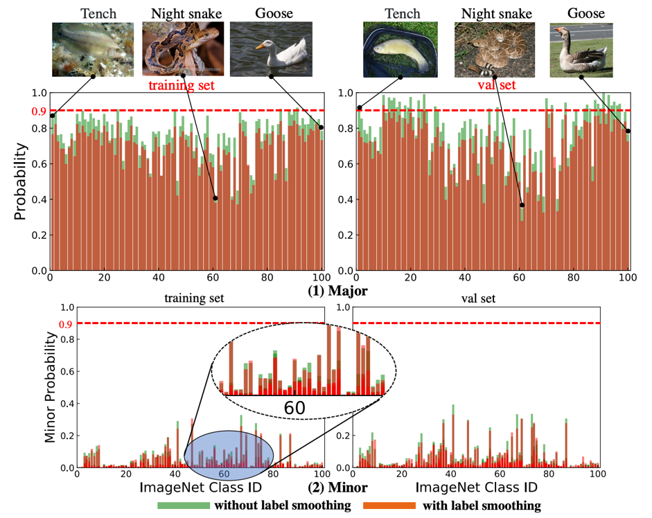 作者首先可视化了 teacher 产生的 soft 的监督信息的分布如下图所示,我们可以看到使用标签平滑训练 teacher 产生的监督信号整体上是低于不使用标签平滑,这跟标签平滑本身的工作机制是一致的。作者还展示了在一些次要类别上的信号分布(下图 2),这也是为什么 soft 标签可以提供更多细微的语义信息差别的原因。