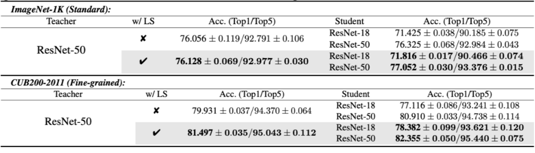 接下来是在图像分类任务上的结果,包括 ImageNet-1K 以及 CUB200-2011。我们可以看到,不管 teacher 有没有使用标签平滑训练,student 的性能基本是跟 teacher 的性能保持正相关的,即 teacher 性能越高,student 也越高。