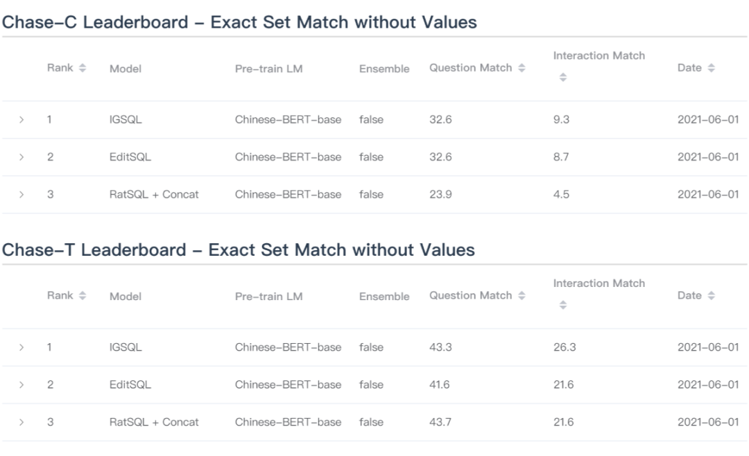 现有的 SOTA 方法在 CHASE 公开榜单上最高 QM 准确率只有 43.7%,还有巨大的提升空间,对语义理解感兴趣的同学不妨来试试刷榜!