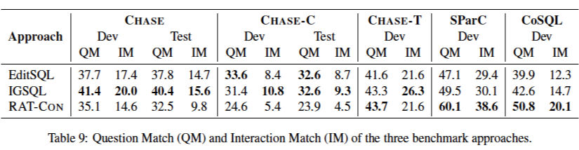 在实验部分,作者选取了 IGSQL [4]、RAT-SQL [5]、EditSQL [6] 3种当前 Text2SQL 领域的 SOTA 方法进行对比,采用问题匹配度 Question Match(QM) 和交互匹配度 Interaction Match(IM)两种评测指标。