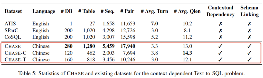 下表统计了 CHASE 和其他多轮 Text2SQL 数据集的对比信息,可以发现 CHASE 规模最大,且标注信息最丰富。