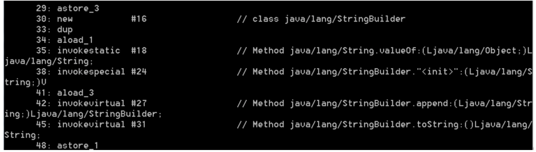 将这段代码编译之后的.class文件,使用 javap -c 进行反编译一下,截取关键的一部分:
