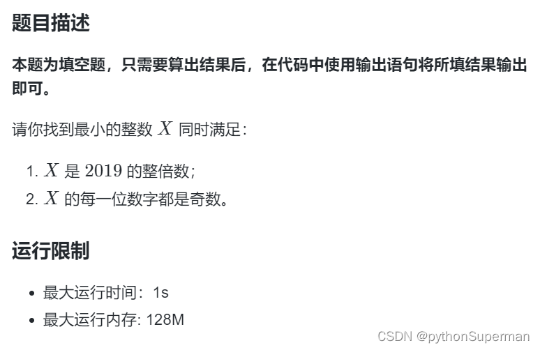 X = 2020 flag = 0 while True:if X%2019==0:flag = 0for i in str(X):if int(i)%2==0:flag = 1if flag == 0:print(X)breakX += 1