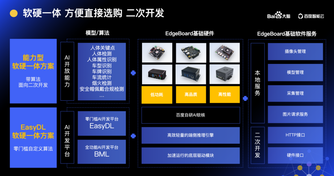 基于一系列低功耗、高品质和高性能的嵌入式 AI 计算卡和边缘 AI 计算盒,EdgeBoard 可无缝兼容百度大脑丰富的算法资源、模型开发平台,将算法模型、基础硬件和基础软件服务紧密结合,方便直接选购和二次开发,成本是 GPU 服务器的 1/20,性能可达 CPU 的数十倍提升。EdgeBoard 还内置了可视化管理系统,开发集成简单,可实现“即插即用”。