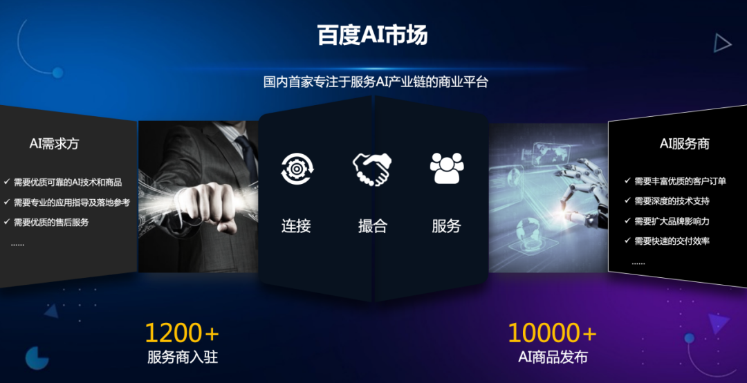 当前,AI 产业处于蓬勃发展的初期阶段,由于信息不对称、供需对接链条长、发展初期品牌影响力较弱等问题,软硬件厂商在实际对接中遇到了不少困难。百度 AI 市场是国内首个专注于服务 AI 产业链的商业平台,旨在链接 AI 需求方和 AI 服务商,打通供需双方,聚集 AI 上下游产品,促进 AI 应用的落地。