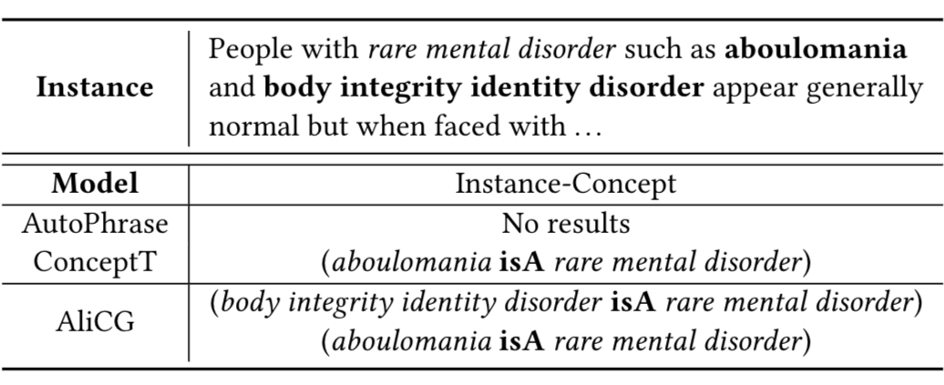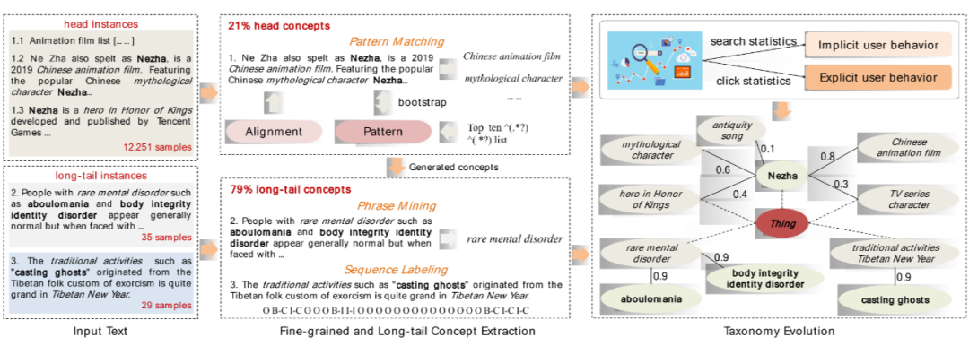 长尾概念挖掘。传统的概念抽取方法通常是基于 Hearst 模板提取概念。然而,这些方法较难从带噪声的开放语料中提取长尾概念。