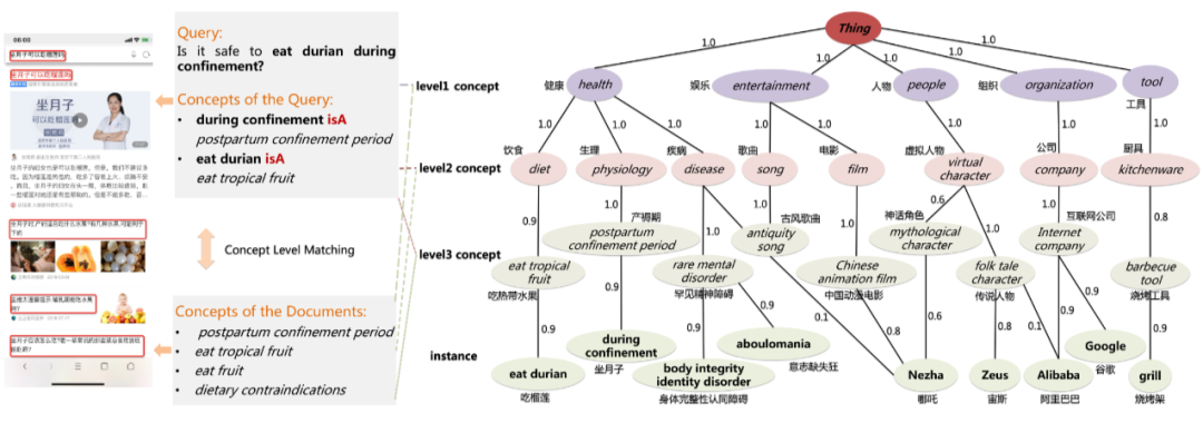 这一模块的目的是随时间变化更新概念信息。我们首先将部分概念与预定义的同义词词典对齐。然后,我们通过通过每天的用户搜索实例热度计算置信度得分,并根据用户的点击行为来估计概念置信度分布。最后,我们将两个不同粒度的置信度得分联合构建实例-概念分类如下图所示。关于构建方法的细节可以参阅我们的论文原文。