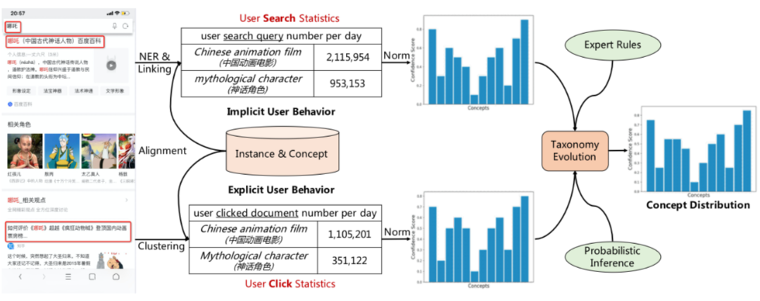 自动概念更新。传统的方法无法随着时间的推移更新概念的信息。例如,“哪吒”在不同的时期有着不同的含义,可以指神话作品人物或者上映影片。因此,必须将时间演化纳入概念分类体系构建中。随着时间的变化,我们需要对齐概念图谱中具有相同含义的节点,并估计给定实例中概念的置信度分布。