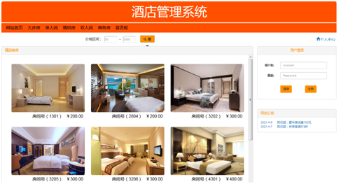 酒店管理系统最主的功能就是对酒店内大量房间和人员进行管理,特别是对于房间的入住情况更是管理的重点,因为一旦房间的入住率提高了,酒店的利润就上来了。对于拥有大量房间的酒店,其设计内容非常复杂多样,例如具有房间信息管理,房间类别信息管理,预订信息管理等功能,并且有许多设计模块,本系统包括房间管理、住宿管理、财务管理、旅客管理等模块功能,即包含酒店客户通过本系统进前端的酒店浏览、客房店预定、新闻查看等,又可以由酒店管理人员进行使用,完成对客人预订登记入住、换房、结账、房间安排等操作。实现: