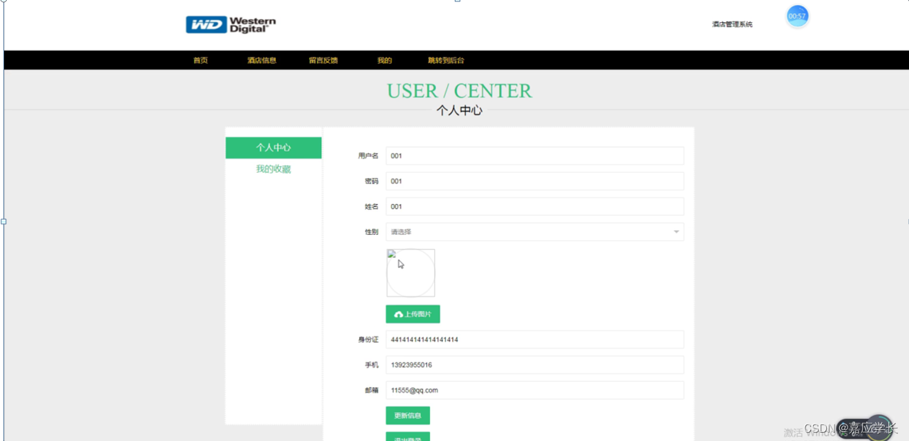 通过网站页面可以查看首页、酒店信息、留言反馈、我的、跳转到后台等信息进行详细操作,如图5-1所示。通过用户注册页面可以填写用户名、密码、姓名、身份证、手机、邮箱等详细信息进行用户注册操作,如图5-2所示。通过个人中心页面可以填写用户名、密码、姓名、性别、图片、身份证、手机、邮箱等详细信息进行个人信息修改操作,还可以根据需要对我的收藏进行详细操作;如图5-3所示。