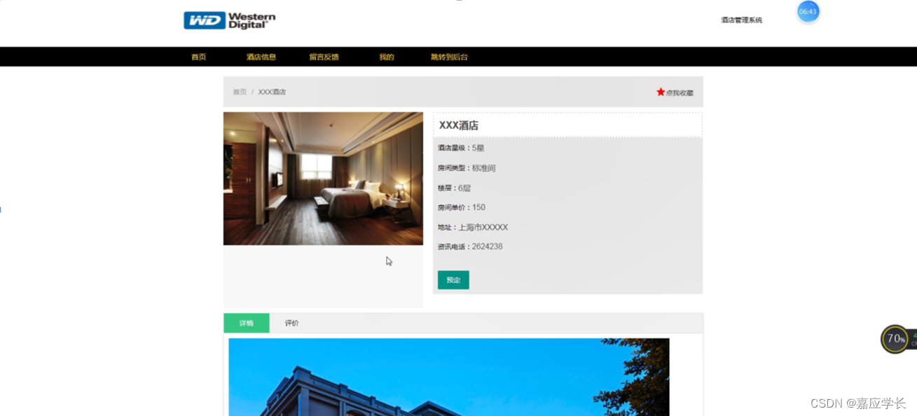 酒店信息:通过酒店信息页面,可以获取酒店名称、酒店星级、房间类型、楼层、图片、房间单价、地址、资讯电话、详情等信息,进行预定、评价或收藏操作,如图5-4所示。
