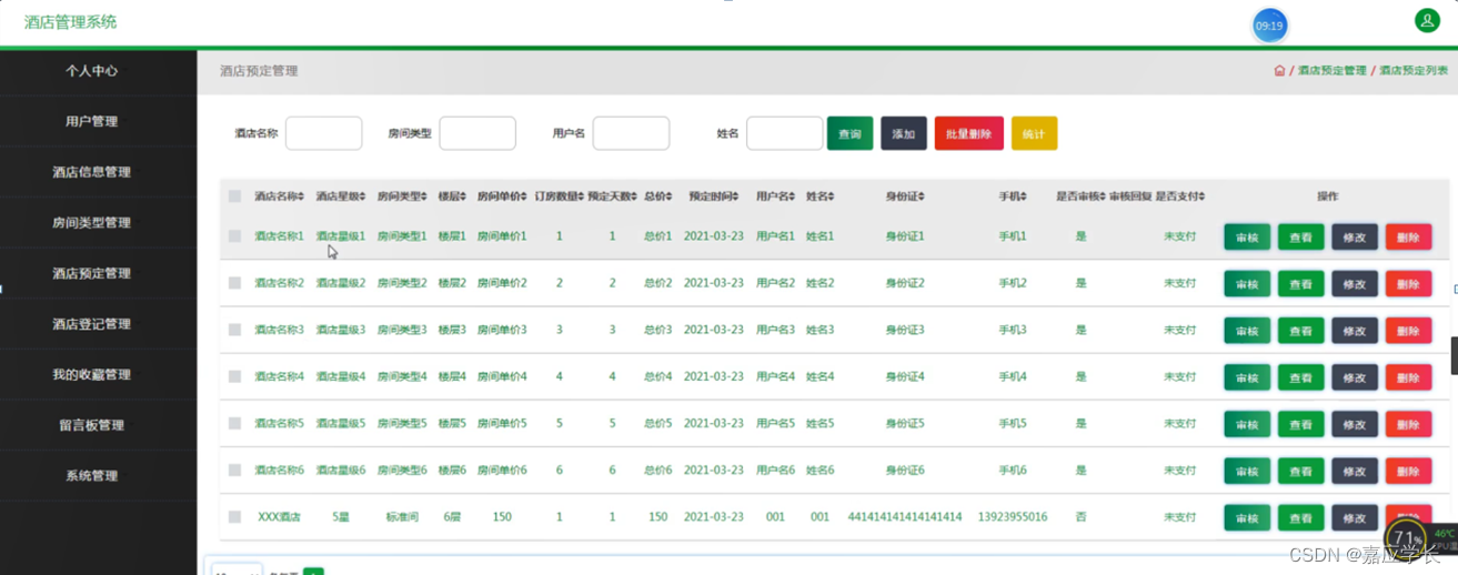 酒店预定管理:通过列表可以获取酒店名称、酒店星级、房间类型、楼层、房间单价、订房数量、预定天数、总价、预定时间、用户名、姓名、身份证、手机、是否审核、审核回复、是否支付等信息,进行审核、查看、修改或删除操作,如图5-12所示。