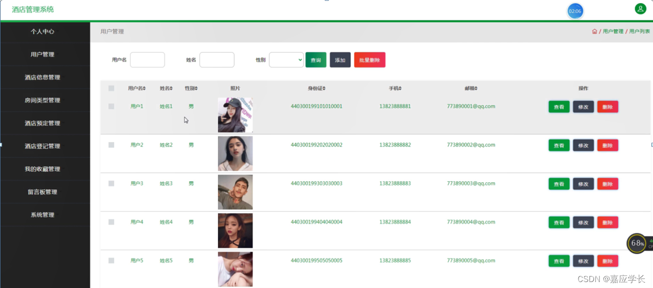 用户管理:通过列表可以获取用户名、姓名、性别、照片、身份证、手机、邮箱等信息,进行查看、修改或删除操作,如图5-9所示。