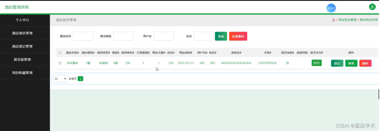 酒店预定管理:通过列表可以获取酒店名称、酒店星级、房间类型、楼层、房间单价、订房数量、预定天数、总价、预定时间、用户名、姓名、身份证、手机、是否审核、审核回复、是否支付等信息,进行登记、查看或删除操作,如图5-6所示。