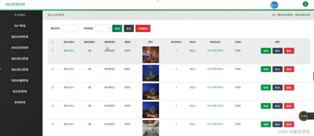 酒店信息管理:通过列表可以获取酒店名称、酒店星级、房间类型、楼层、图片、房间单价、地址、资讯电话、详情等信息,进行查看、修改或删除操作,如图5-10所示。
