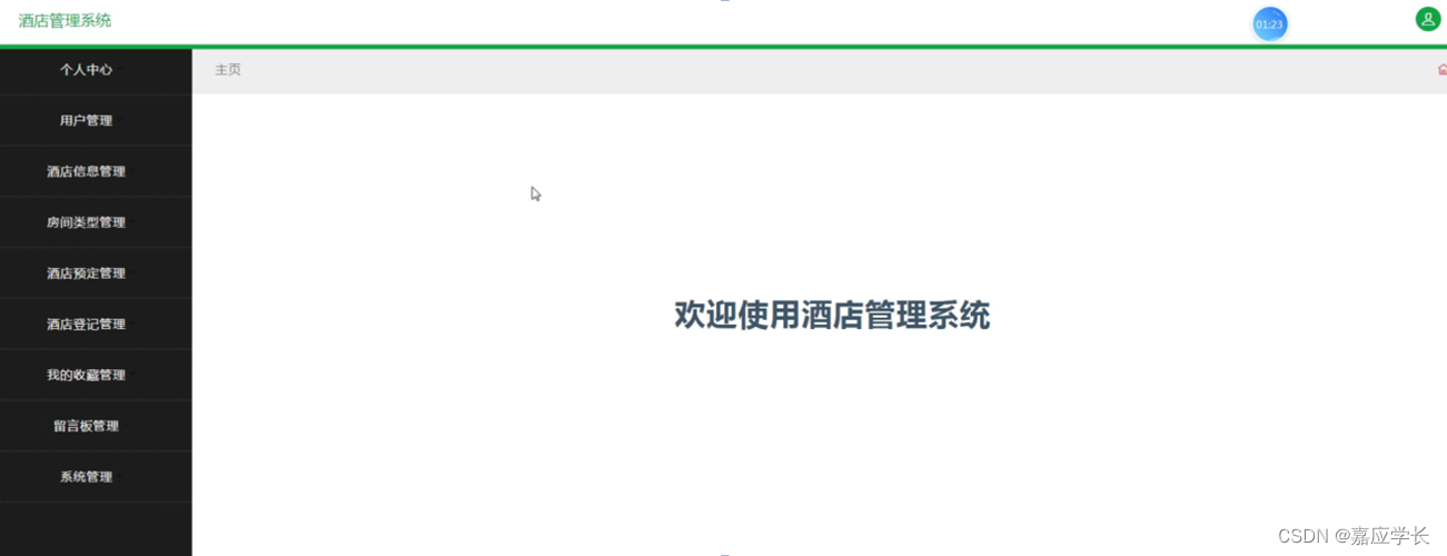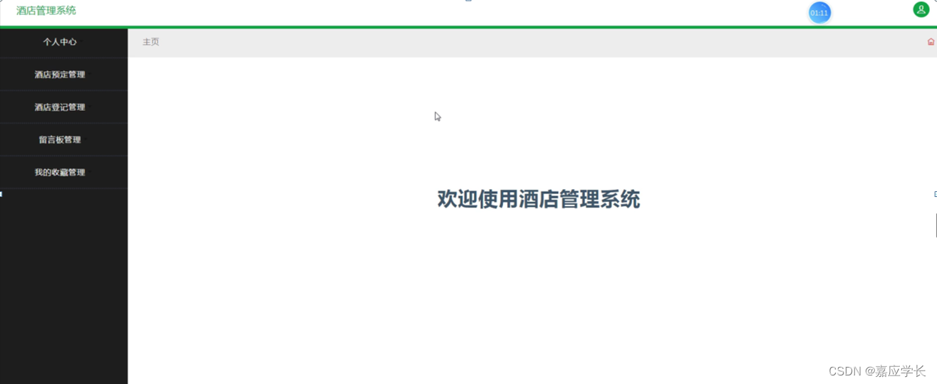 用户点击后台进入到系统操作界面,可以对个人中心、酒店预定管理、酒店登记管理、留言板管理、我的收藏管理等功能进行详细操作,如图5-5所示。