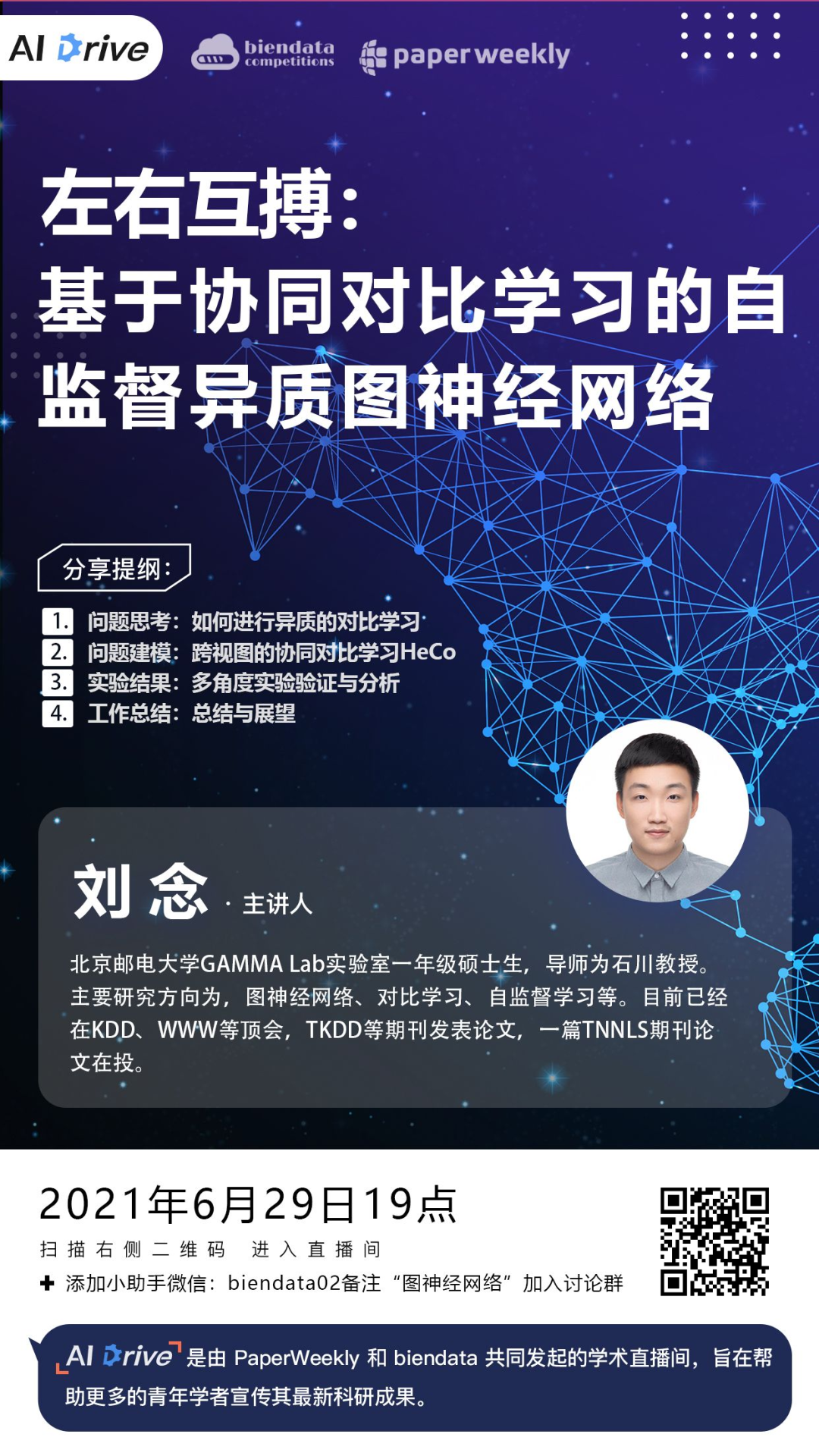 本期 AI Drive,我们邀请到北京邮电大学 GAMMA Lab 实验室硕士生刘念,为大家在线解读其发表于 KDD 2021 的最新工作:Self-supervised Heterogeneous Graph Neural Network with Co-contrastive Learning。对本期主题感兴趣的小伙伴,6 月 29 日(周二)晚 7 点,我们准时相约 PaperWeekly B 站直播间。